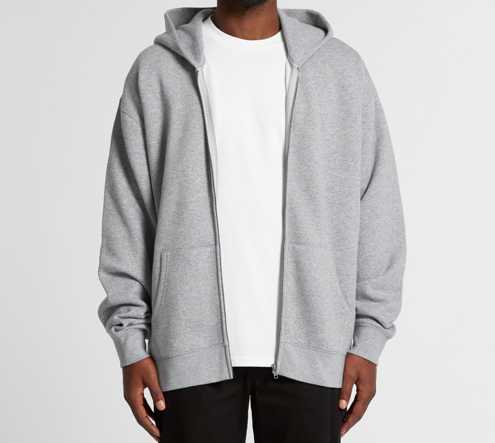 Medium weight relaxed fit men’s hooded jacket with metallic zipper and kangaroo pockets. Crafted from premium quality and ethically sourced fleece and pre-shrunk cotton blend, it ensures durability and minimal shrinkage.